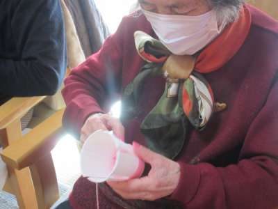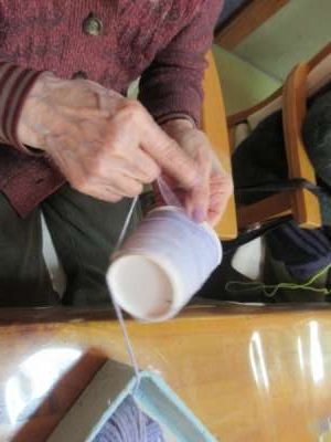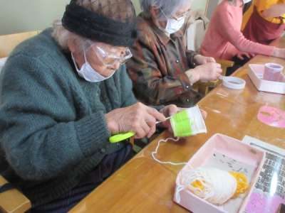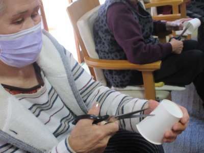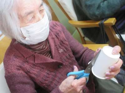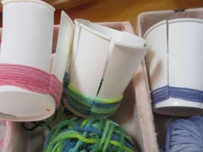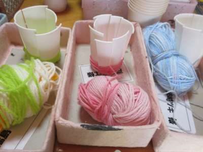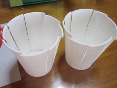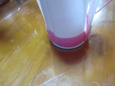 そして、ハサミで切れ目を入れた紙コップに、毛糸を