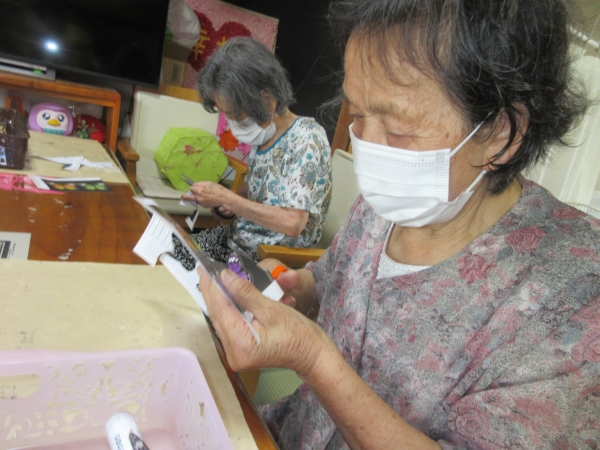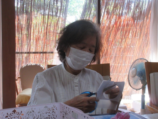 細かい部品を切っり真剣な顔の母です