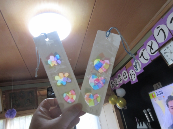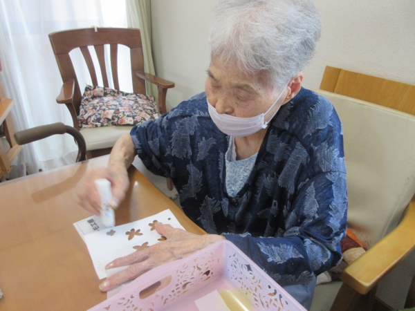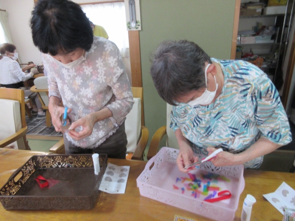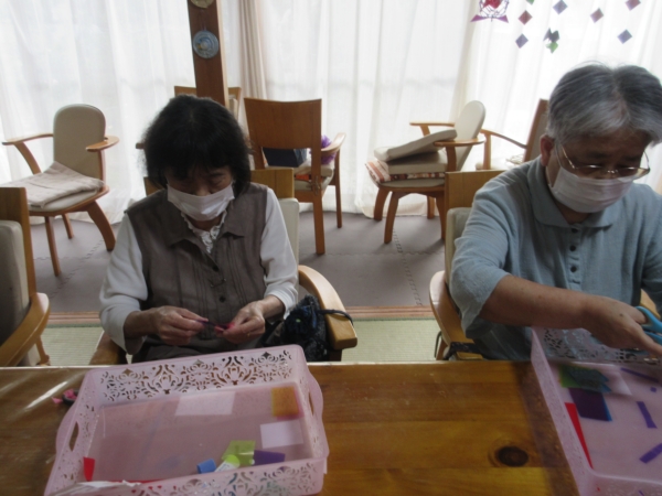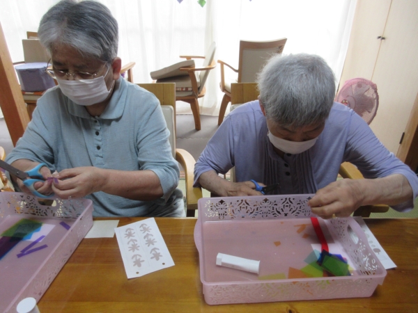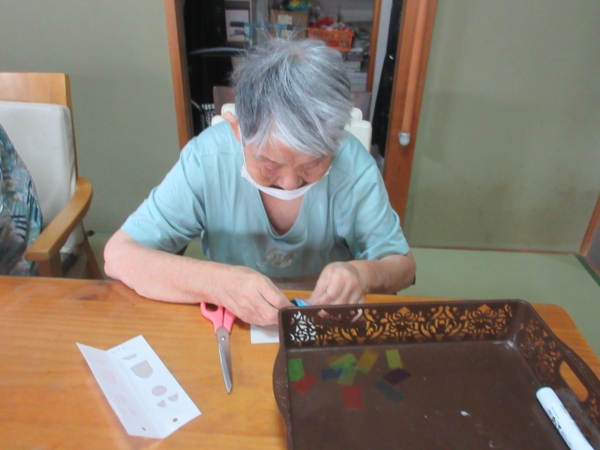 切ったセロハンを切り抜いた模様の上に散りばめて貼っていきます