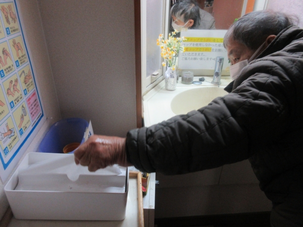 玄関前でアルコール消毒をして頂き、