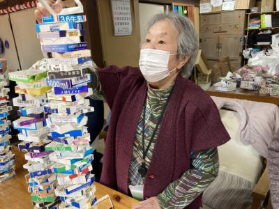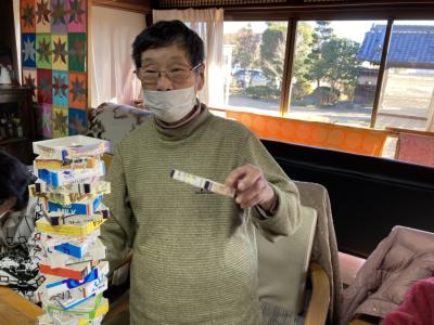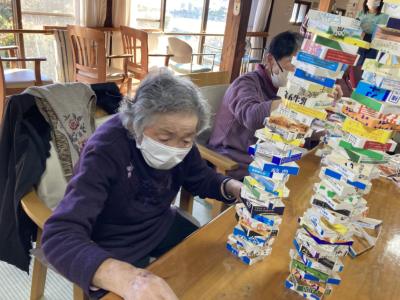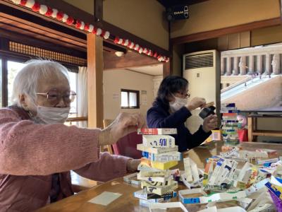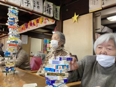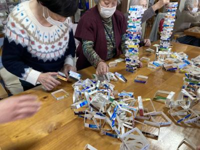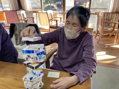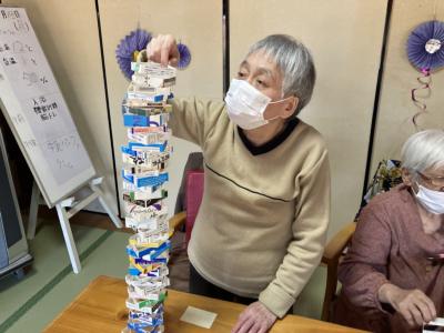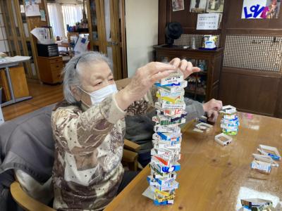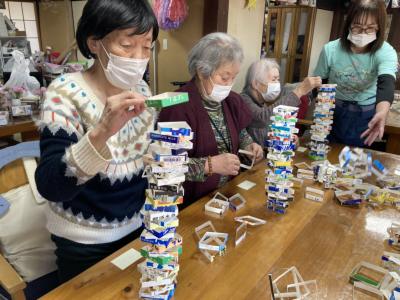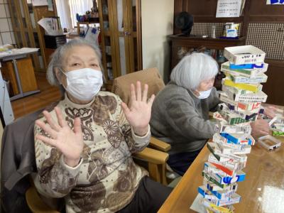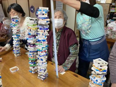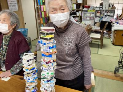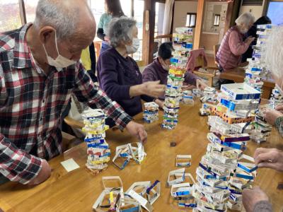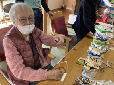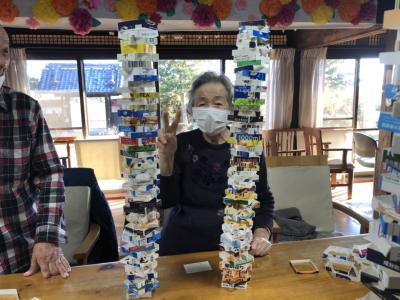 午後は牛乳パック積みゲームを行います