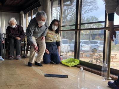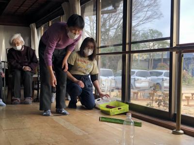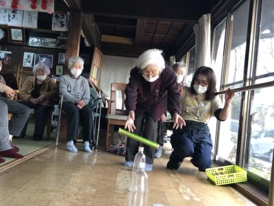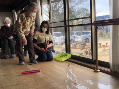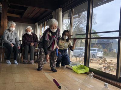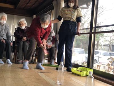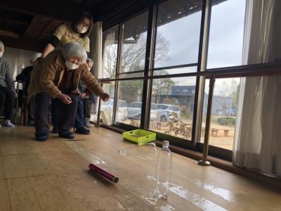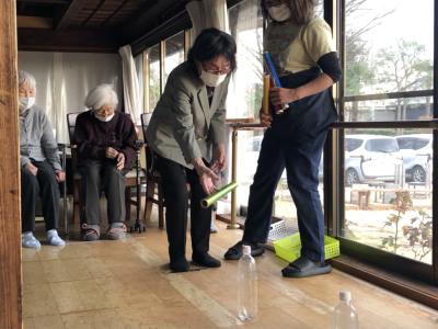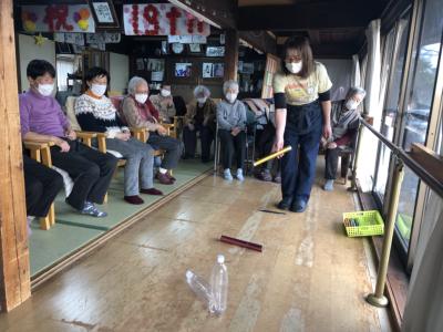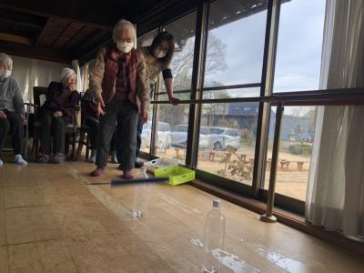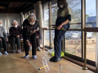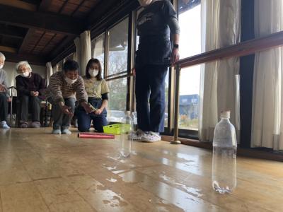 5本のペットボトルを手前から1本ずつ順番に倒していくゲームです