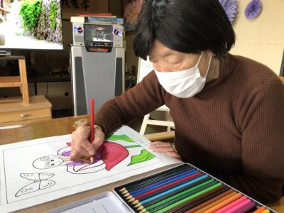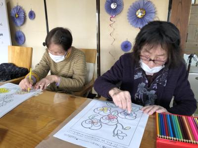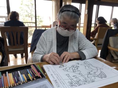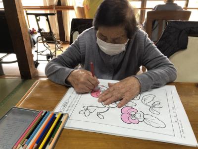 脳トレでは塗り絵や計算問題、ソロバンや地理問題等・・・