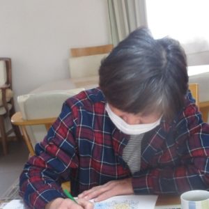 しっかり水分も補給したら、前に行ったお花のぬり絵を