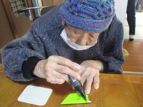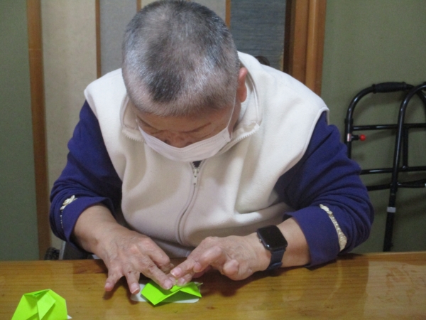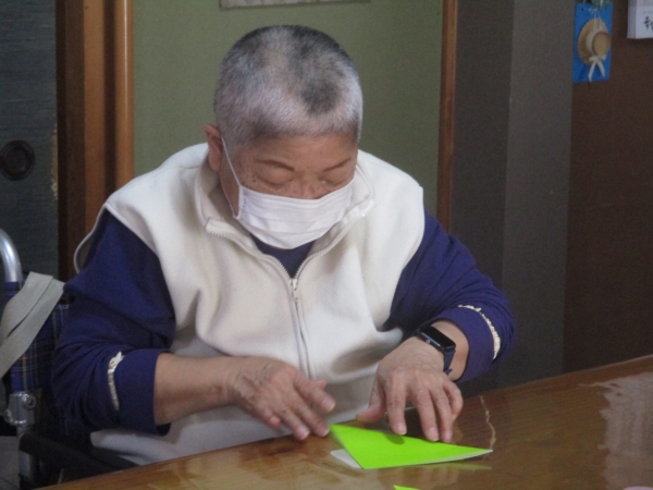 まずは、黄緑の折り紙でウグイスを作りますよ~