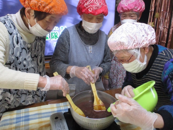 母達が集まり、興味深々で混ぜ混ぜ