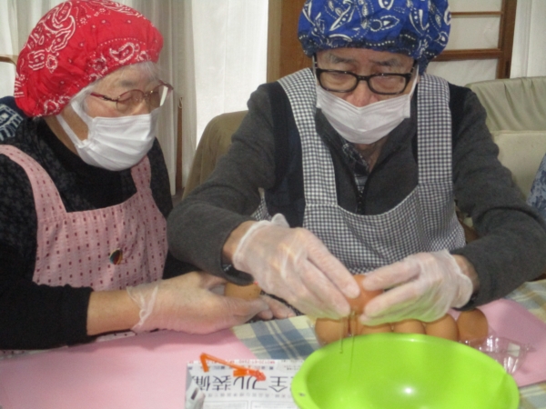 父と母、二人で卵をボールに割りいれ、丁寧にかき混ぜる