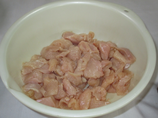 鶏肉は、皮を取り覗き、一口大の削ぎ切りにします。