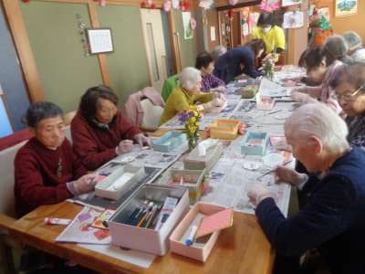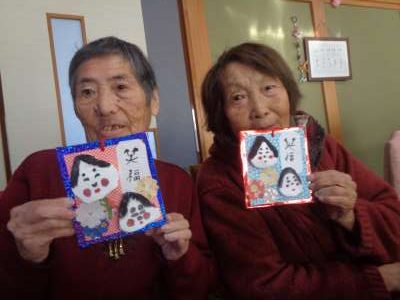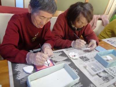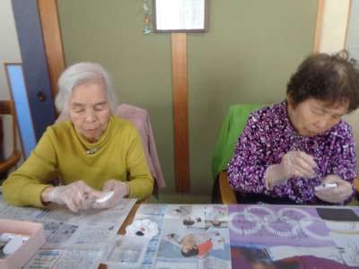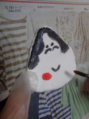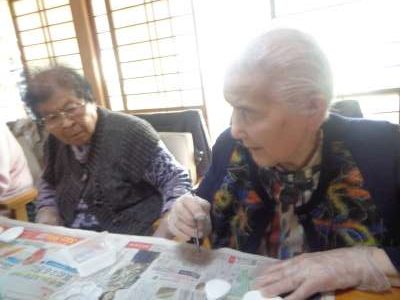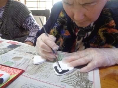 母は糊を付けて台紙貼りをするところです