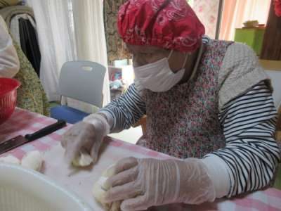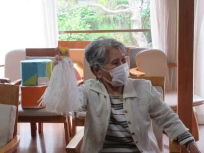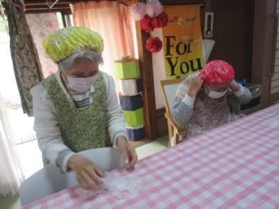 エプロン、三角頭巾、ゴム手袋をつけた後、アルコール
