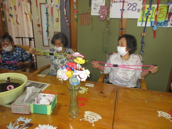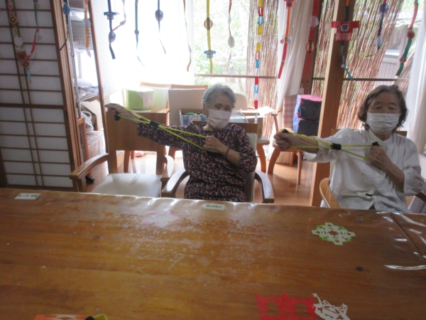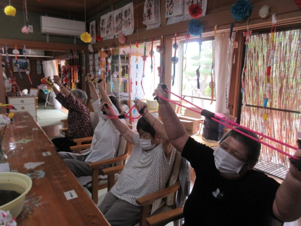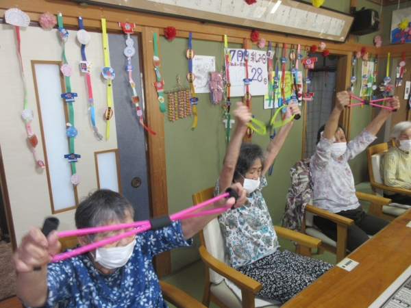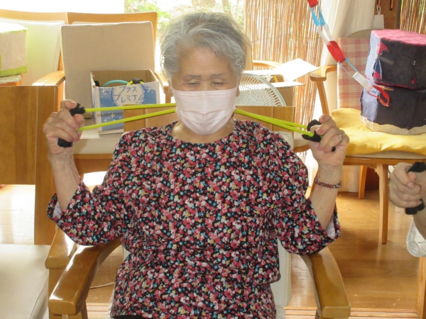 ゴムを伸ばしたりする事で、柔軟性を高めたり、筋力強化につなげます