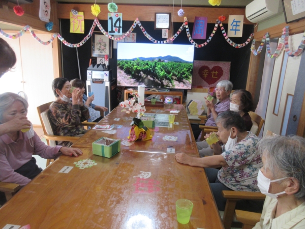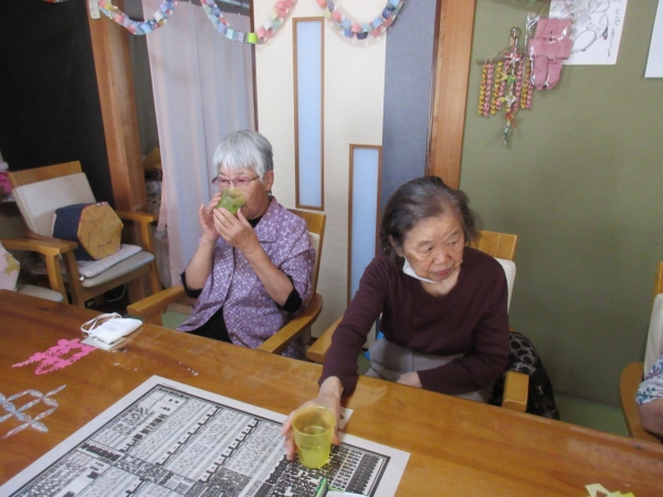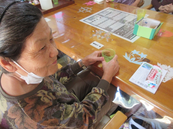 歌謡体操で身体を動かした後は、水分補給で梅ジュースを