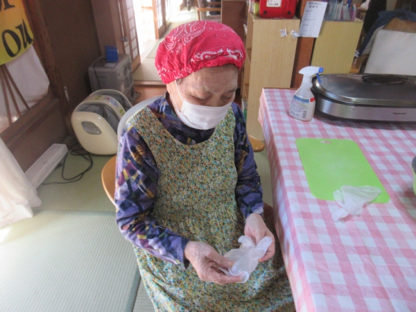 調理に入る前に、エプロン、三角頭巾、ゴム手袋を着用していきます