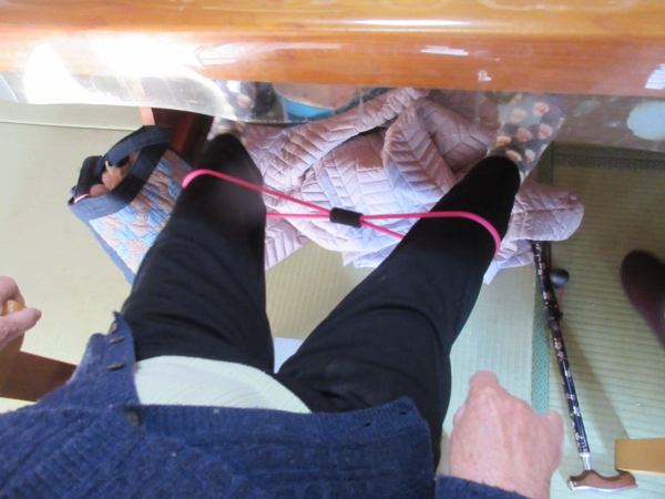 最後は、太ももにゴムをかけて、負荷をかけていきます