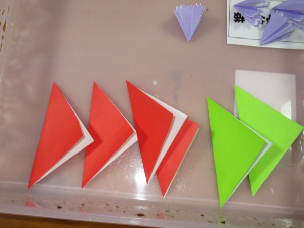 では、4等分に切った折り紙を三角に折って下さ~い△