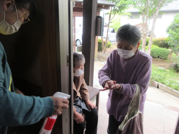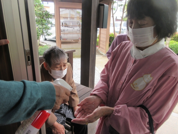 玄関先でアルコール消毒をして頂き…