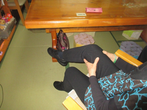 次は、手で膝を抑えて、足の力をぬいてブラブラさせます