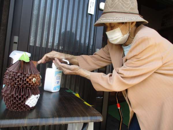 朝のご来庵時は入室前に、手指消毒をしていただいています