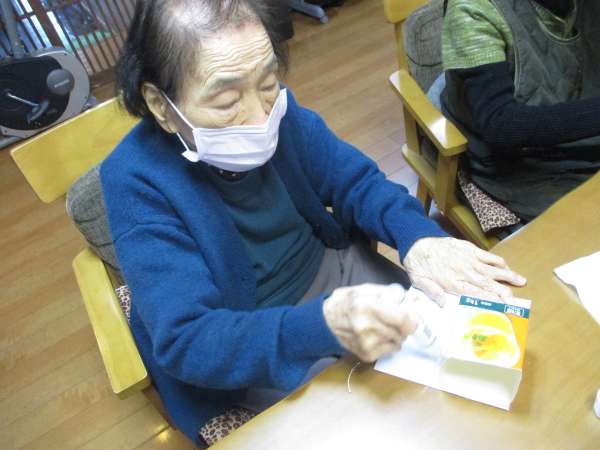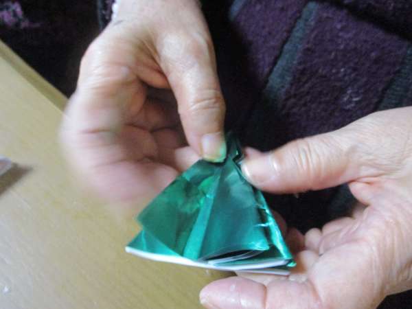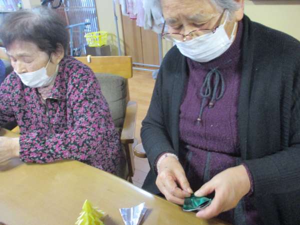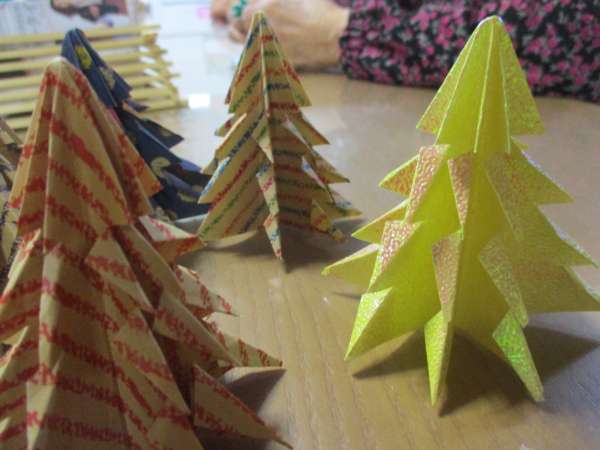 お昼休みに、クリスマスツリーを折り紙で作ってみました