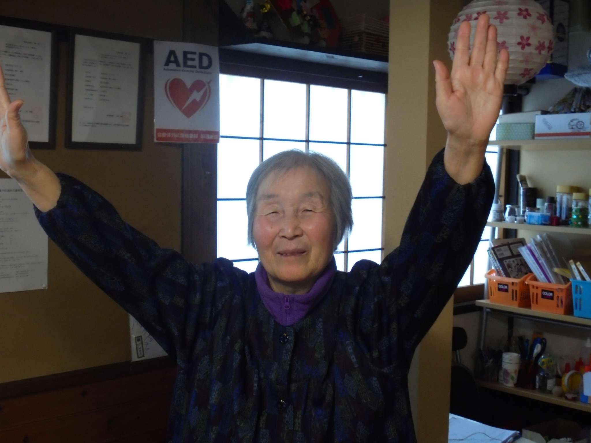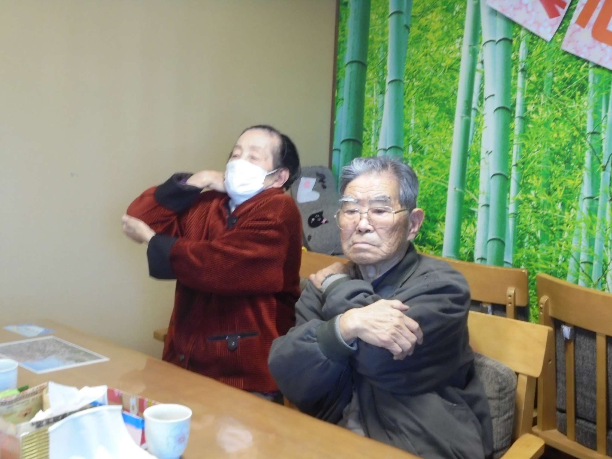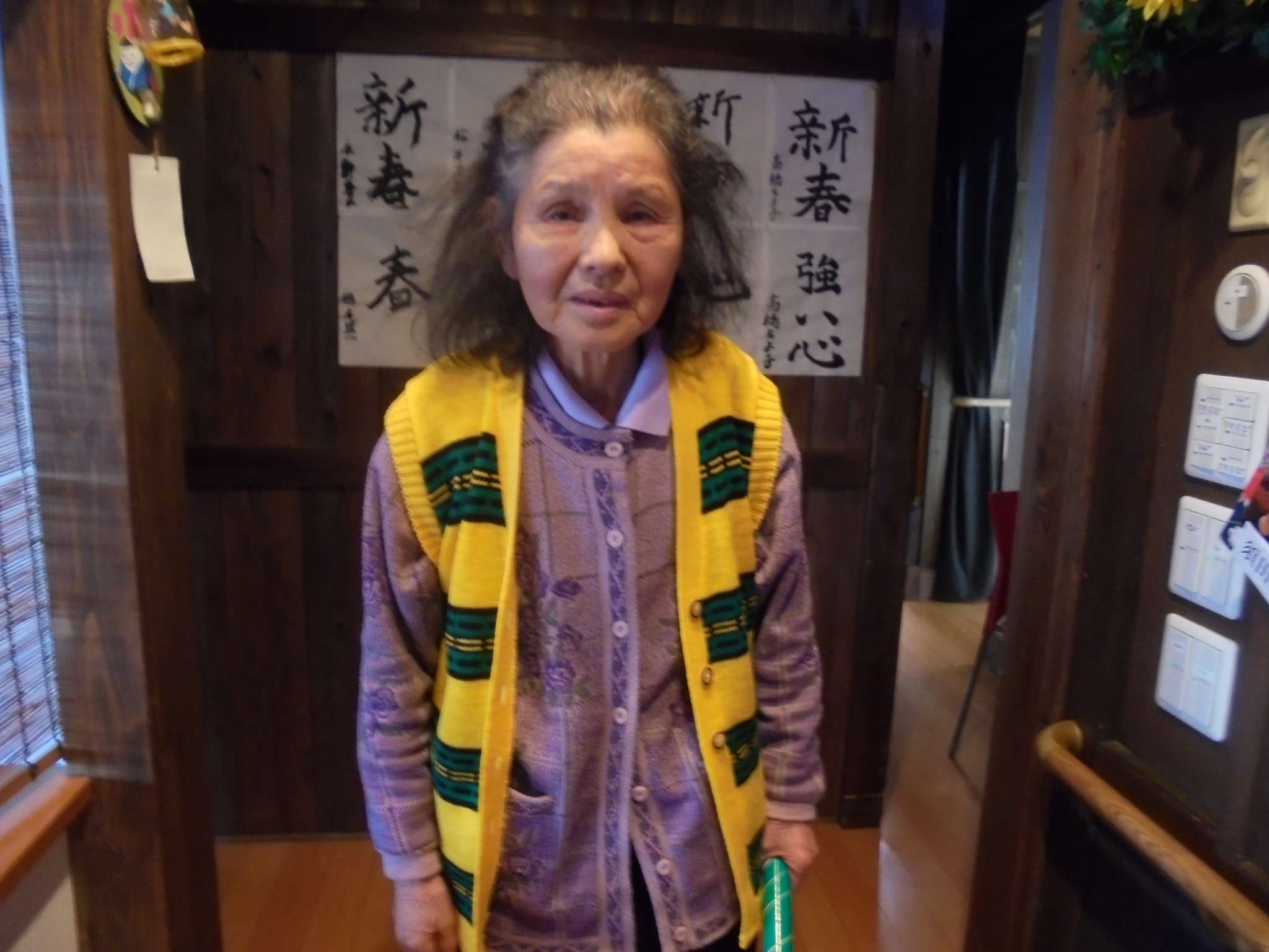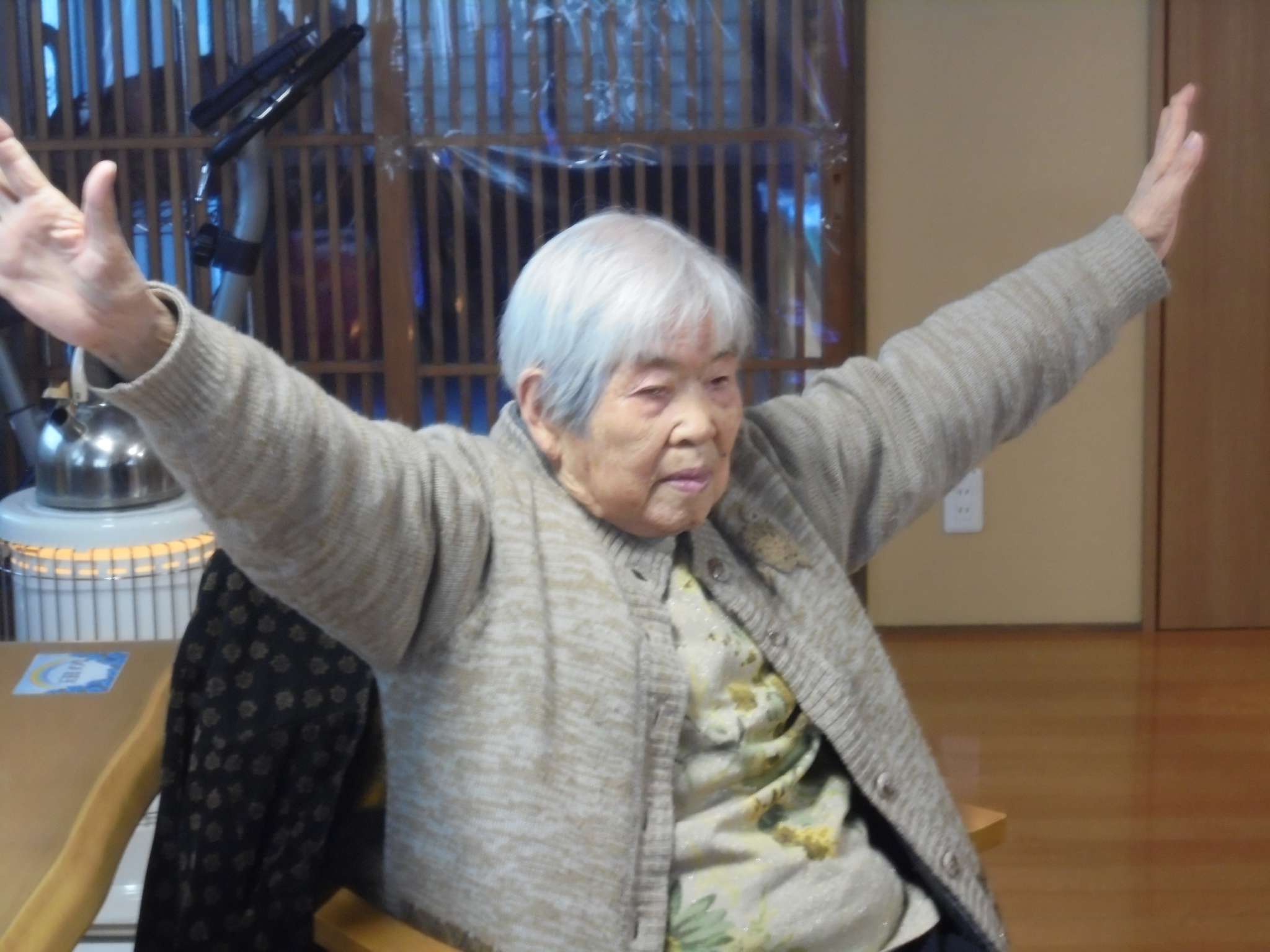午後は体操の後、室内での歩行訓練です。 本当は、外での散歩で気分転換の歩行訓練といきたいところだったのですが、冷たい風がでてきたので庵内にて行いました。