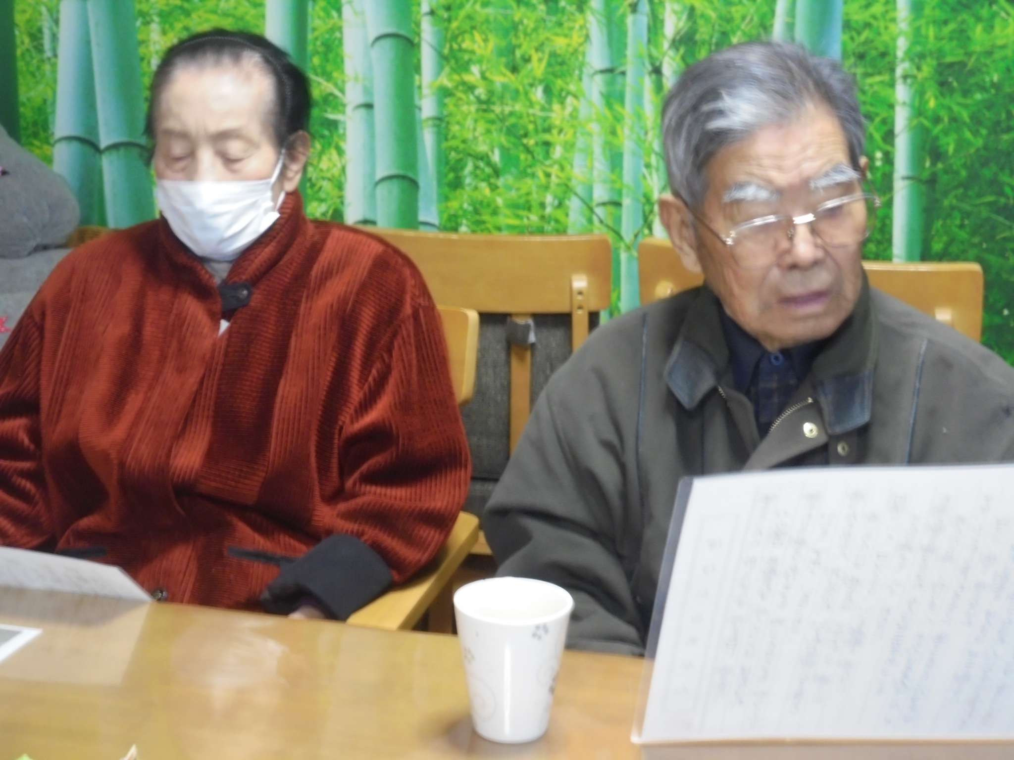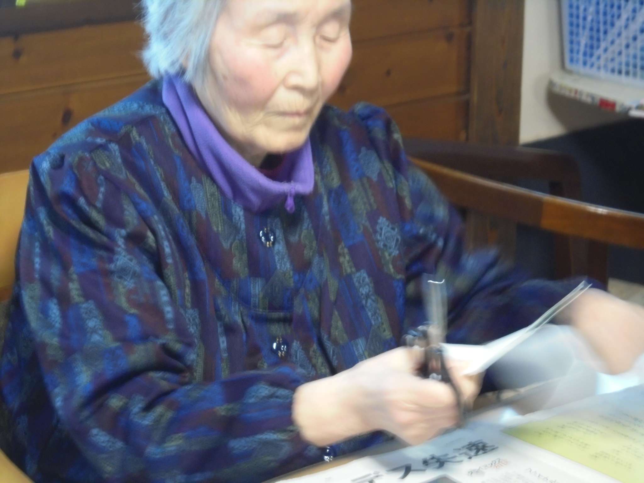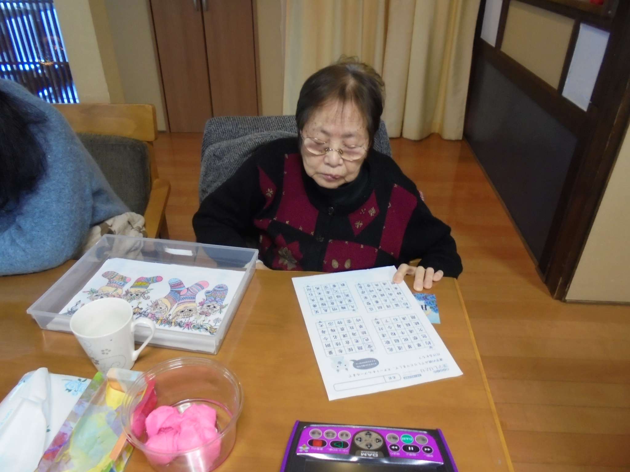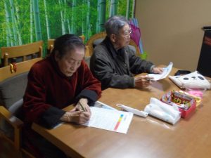 午後は体操の後、室内での歩行訓練です。 本当は、外での散歩で気分転換の歩行訓練といきたいところだったのですが、冷たい風がでてきたので庵内にて行いました。