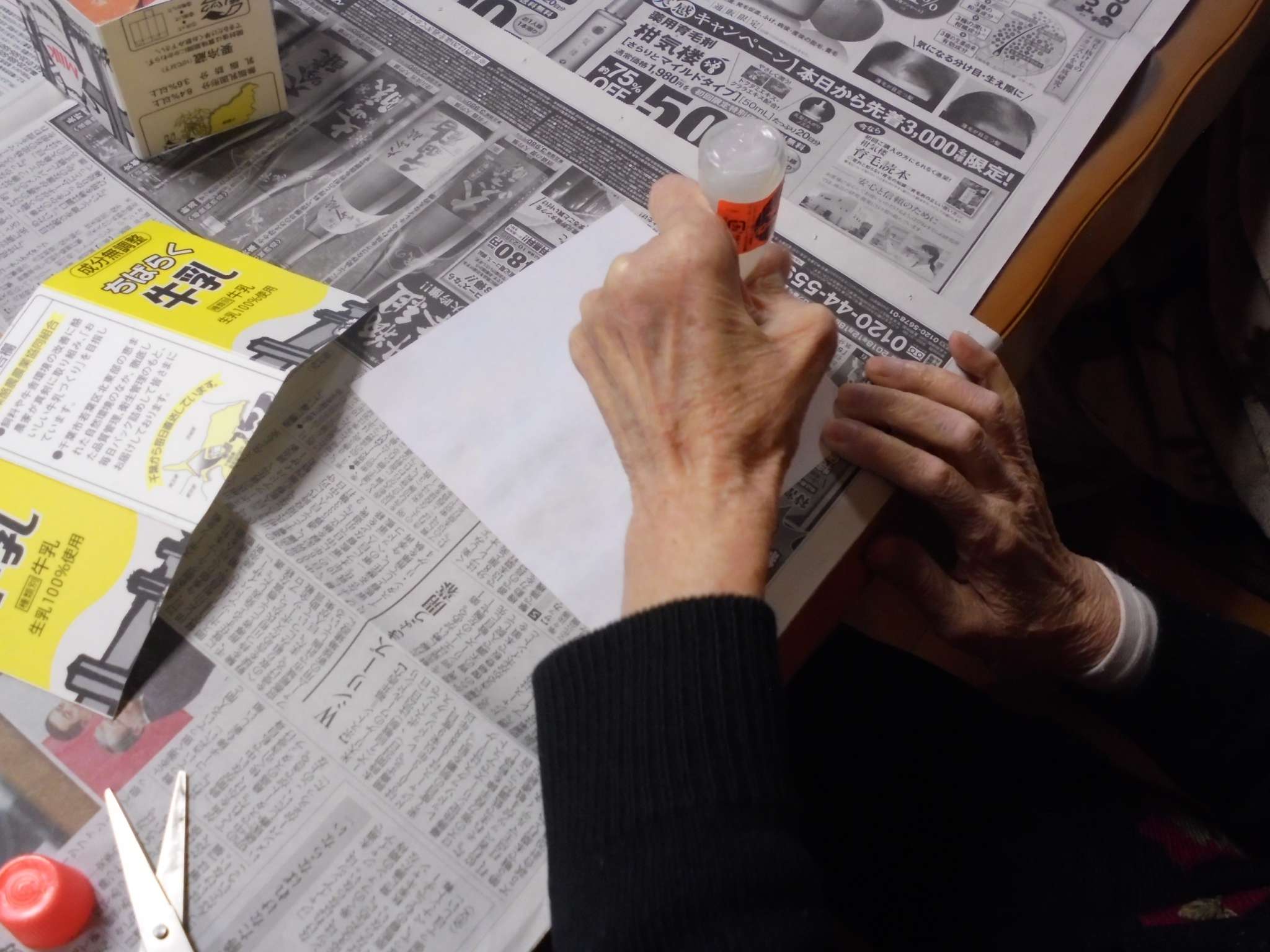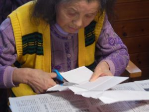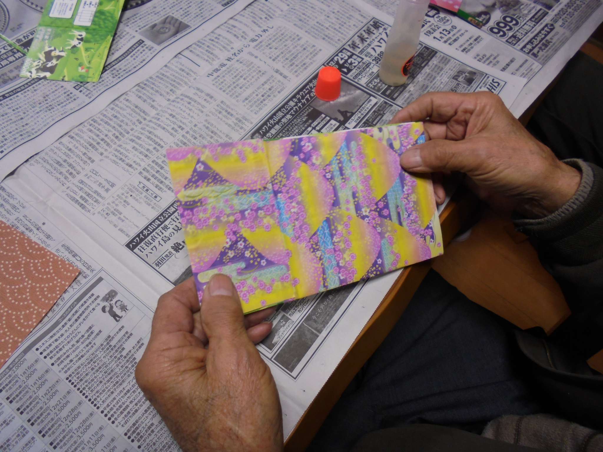 ペン立てを作りましょう! まずは、厚紙に和風柄の折紙を貼りましょう!