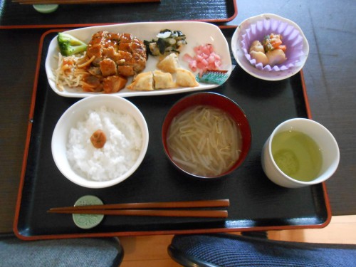 今日の昼食「ハンバーグと揚げ餃子」