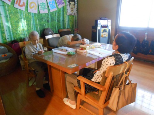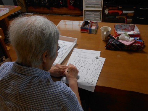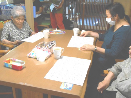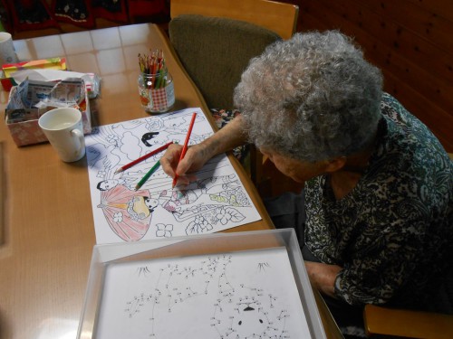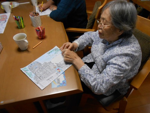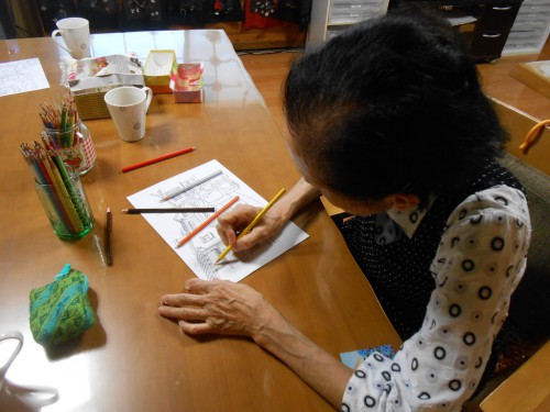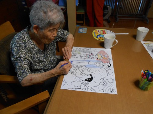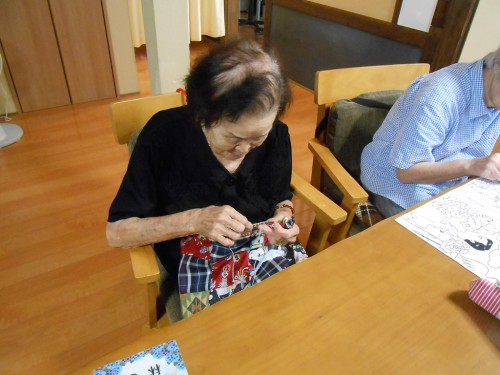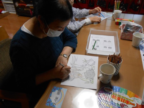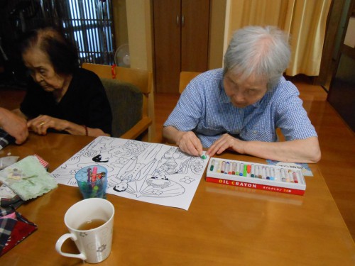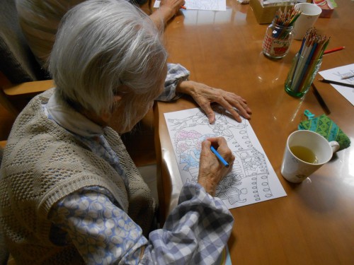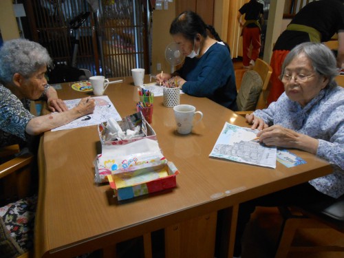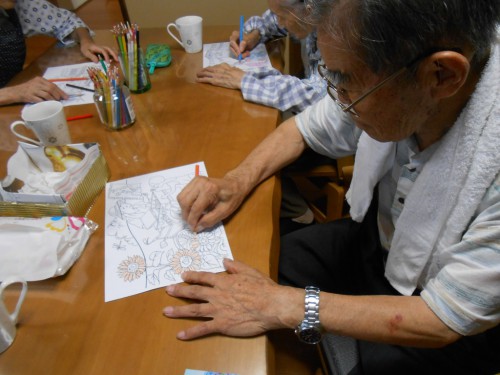 レク時間「大人のぬりえ、裁縫」に分かれて行いました。