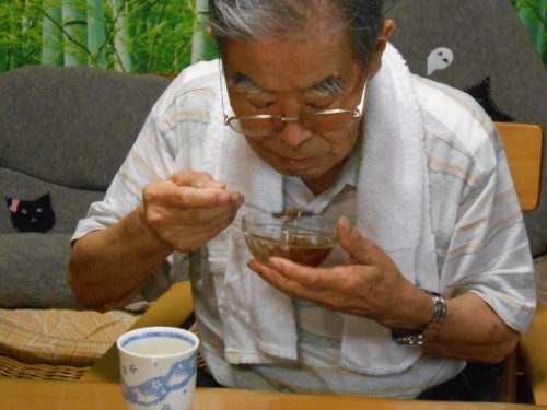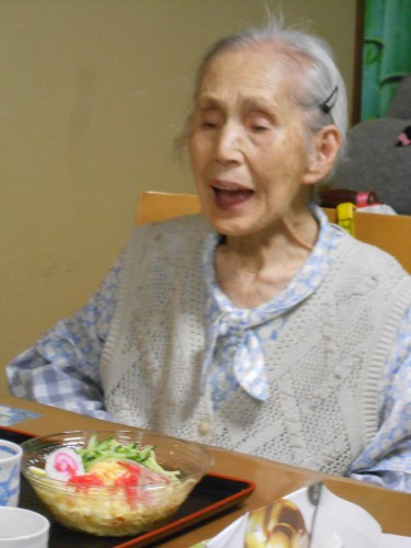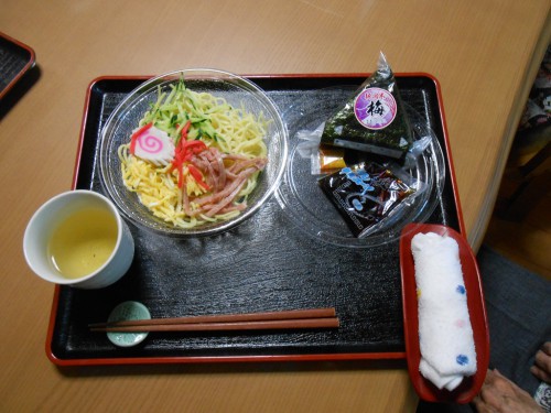 今日の昼食「冷やし中華と梅おにぎり」、いっぱい食べてね。