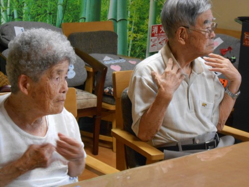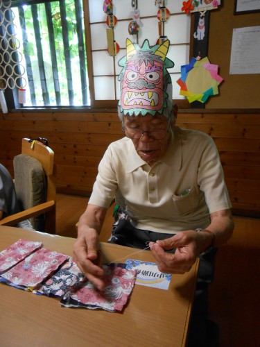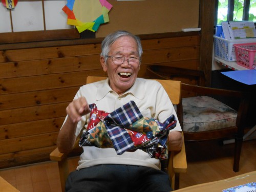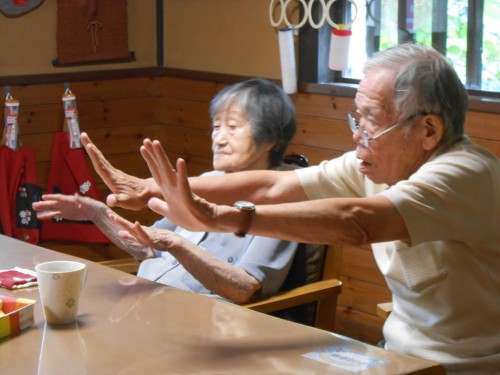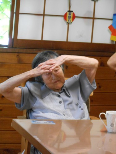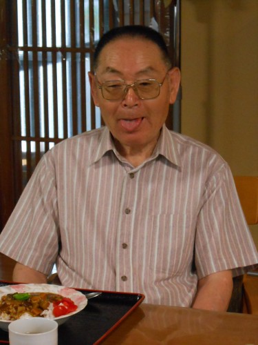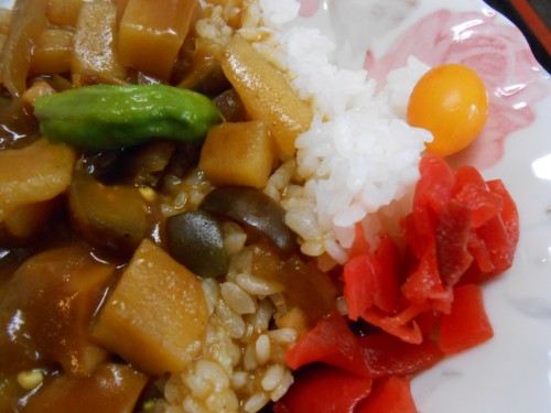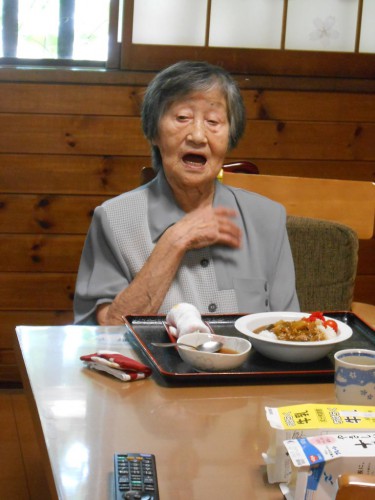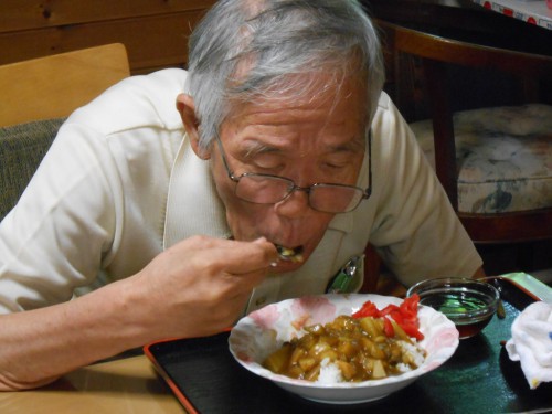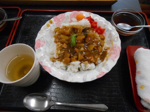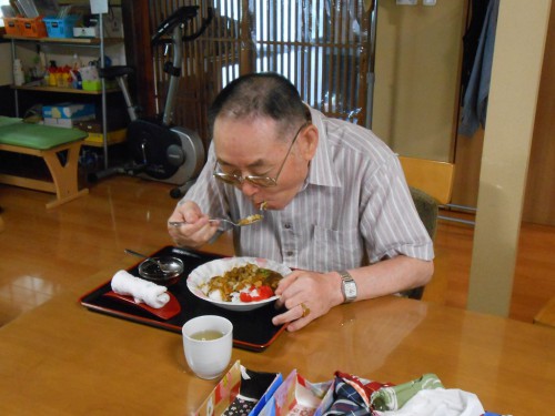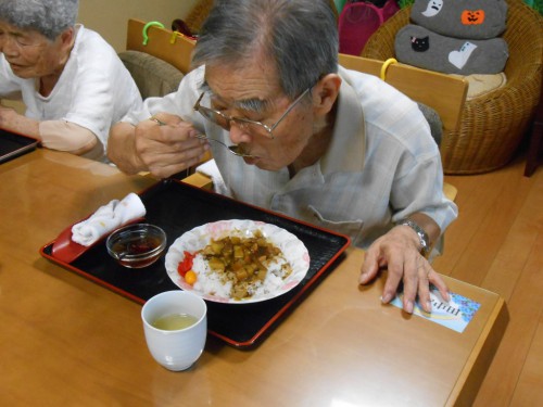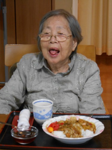 口腔体操後、庵で収穫した野菜も入ったカレーをどうぞ