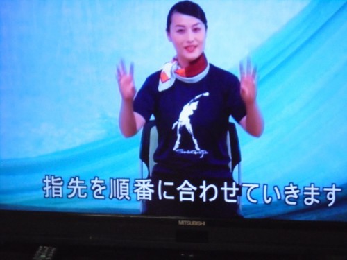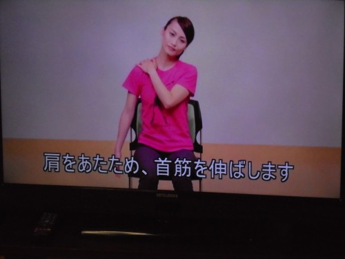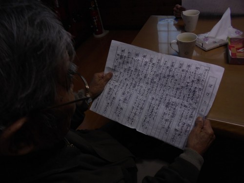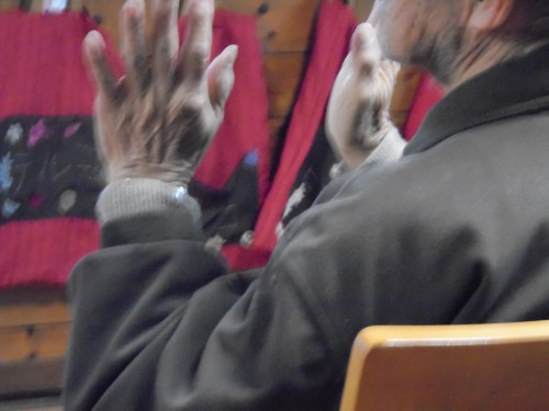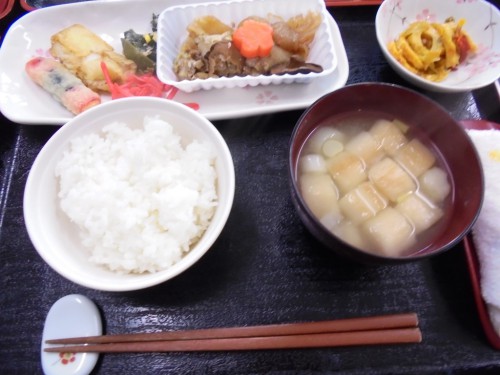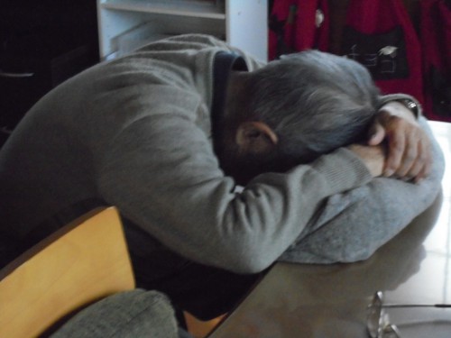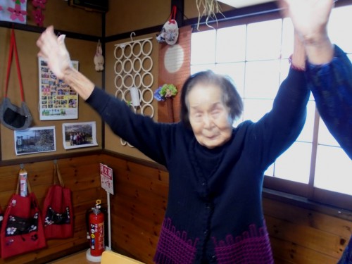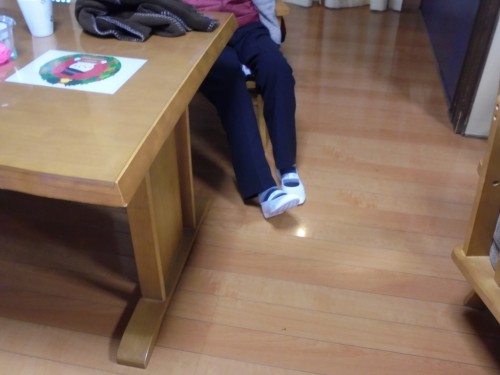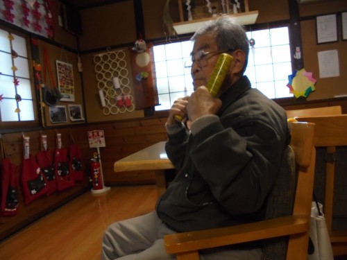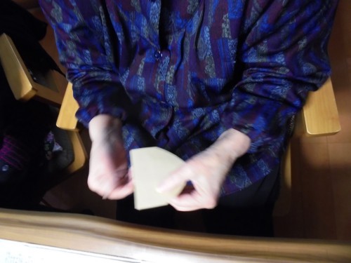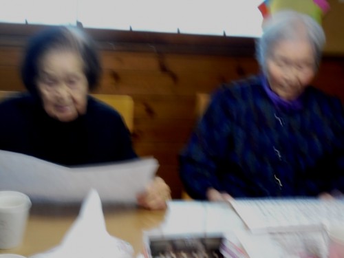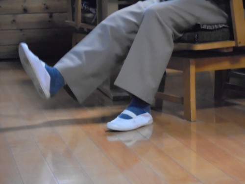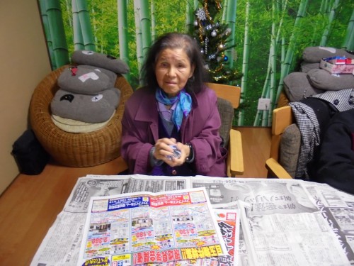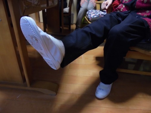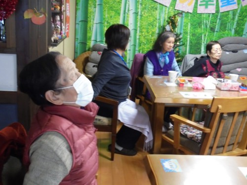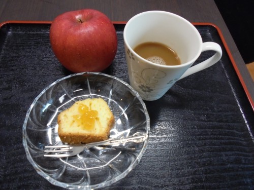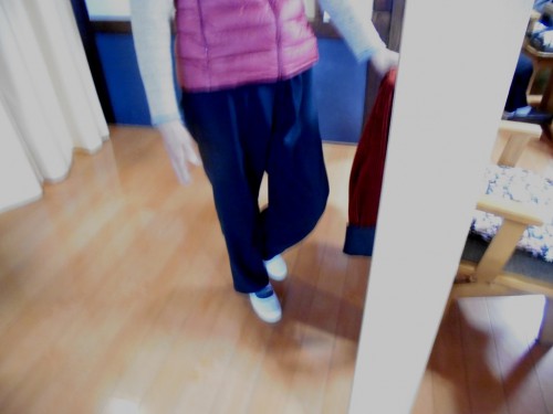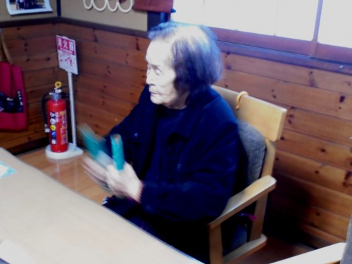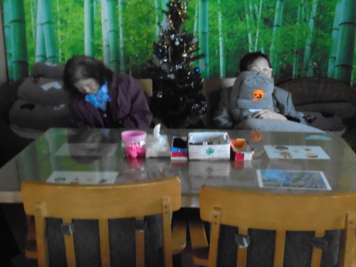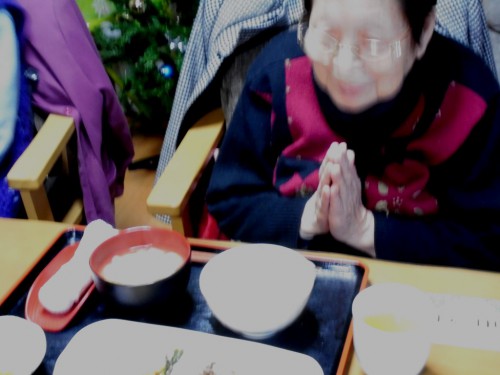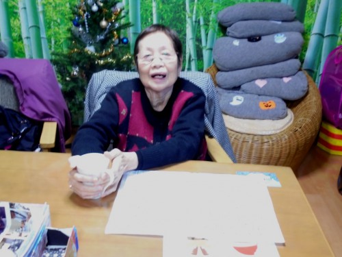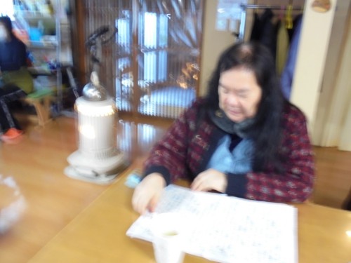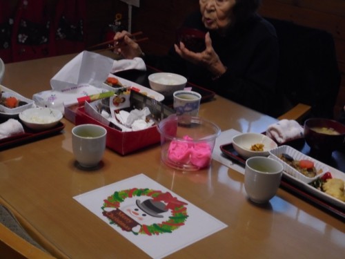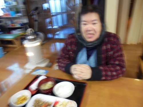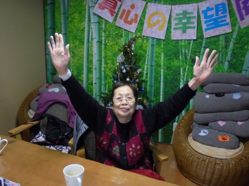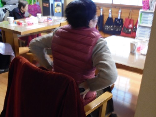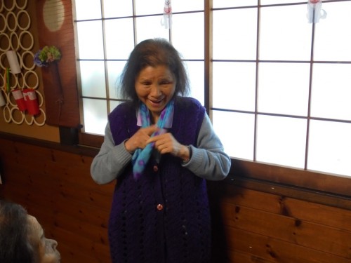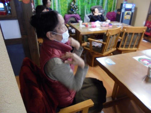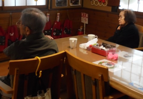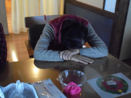 食後の一コマです。「スカーフとってもいいじゃない、似合ってるね!」