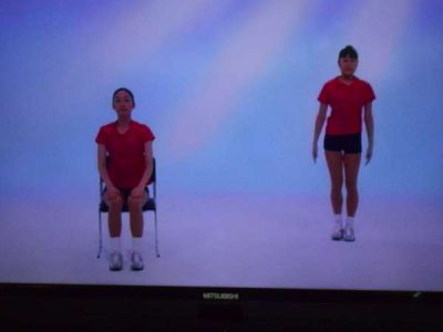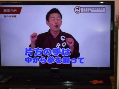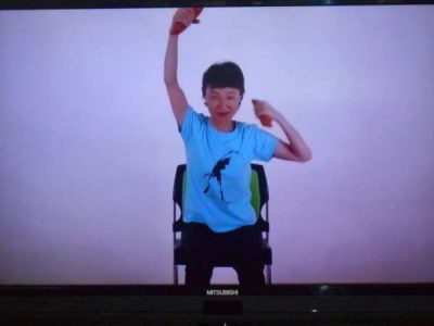 ラジオ体操1 (one)2 (two)1 (one)2 (two)あせあせ (飛び散る汗)