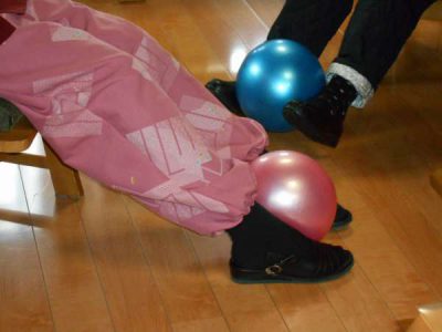 足にボールをはさみー (長音記号2)ももの上下運動や足首を振ることで