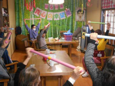 棒を投げてキャッチパンチ みなさん上手にとってますねうれしい顔