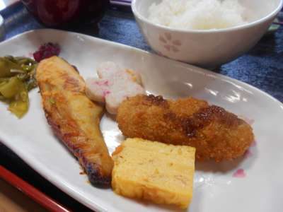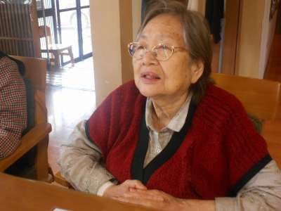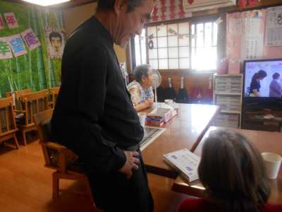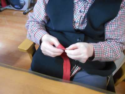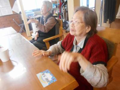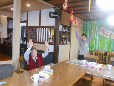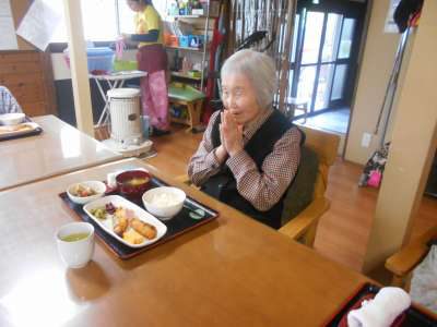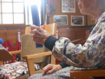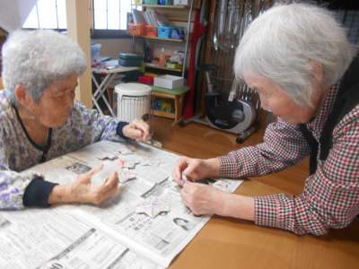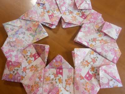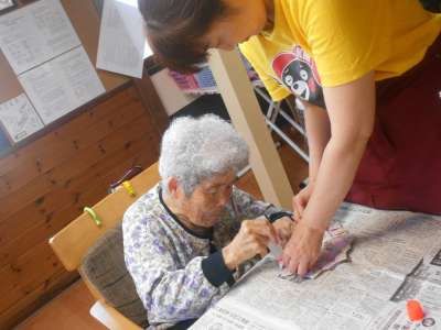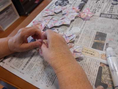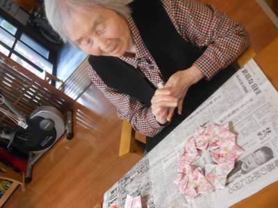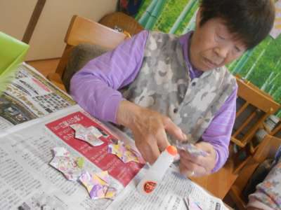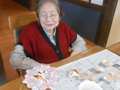 昼食前に、折り紙やっこさんの貼りあわせをして