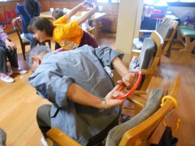 皆さんにイスを輪にしていただいて輪投げの輪っかを持ち