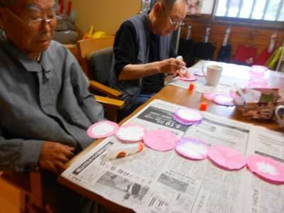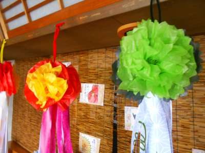 ふき流しの上にある、くす玉は庭に咲くダリアを見て