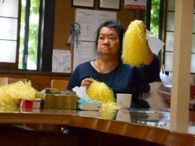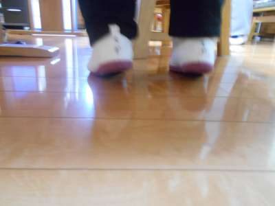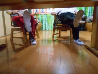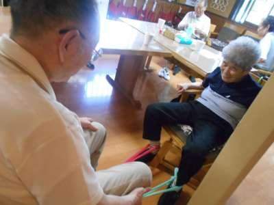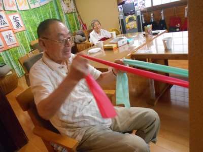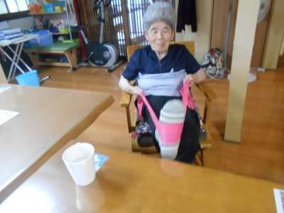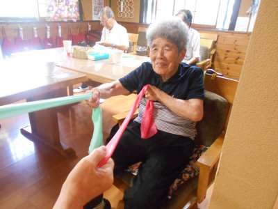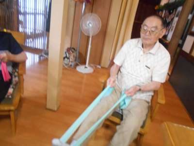 こちらも同様足にゴムチューブをひっかけての伸縮運動で