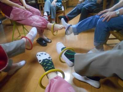 輪投げの輪っかを使ってストレッチをしてゆきます