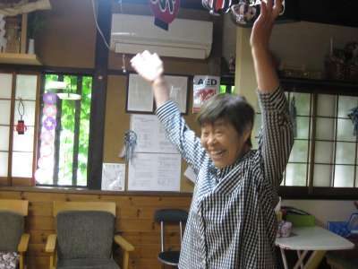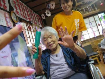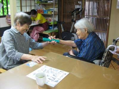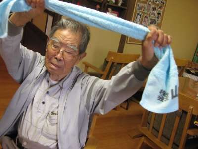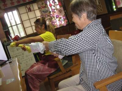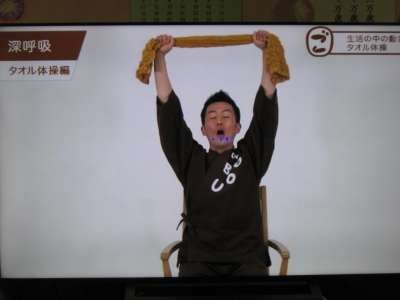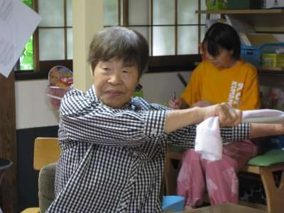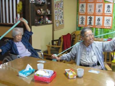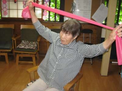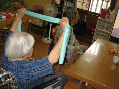 伸び伸びゴムチューブを持って上に伸ばしたり・・・