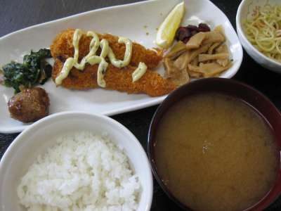 昼食は大きいエビフライと塩やきそば(◍•ᗜ•́)✧