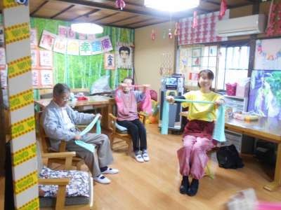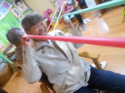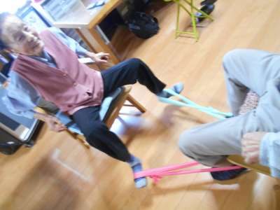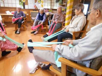 ゴムの伸縮を利用して筋トレやストレッチ運動をしてゆきます
