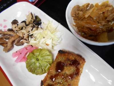 鰆のフライ・牛焼肉・小龍包・キノコ煮・漬物