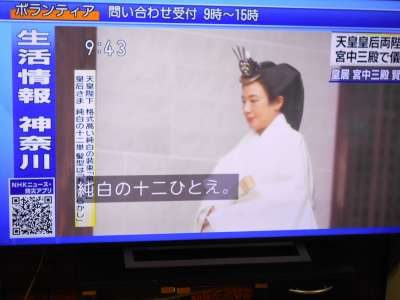 みな揃って見ているのは「即位礼正殿の儀」