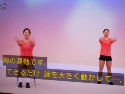 みんなの体操を手 (パー)考えてる顔手 (パー)あせあせ (飛び散る汗)