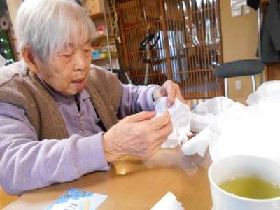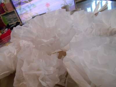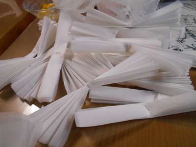 ジャバラ折りしたたくさんのお花紙を開いていきます