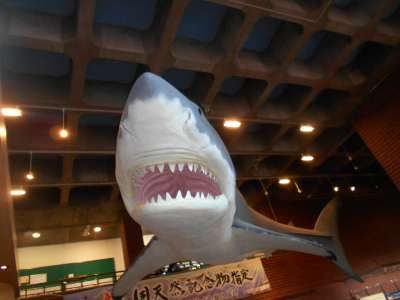 館内入口では巨大サメがお出迎え冷や汗2 (顔)あせあせ (飛び散る汗)