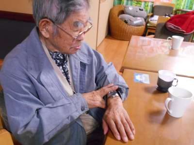 腕時計を見て、本日の日付の確認をするお父さん腕時計