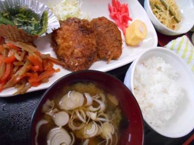 ソースひれかつ・塩焼きそば・金平・お浸し・プチ玉子焼き
