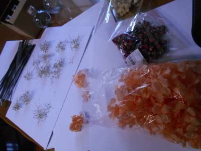 紫陽花や小バラ、カスミソウなどを瓶に詰めて